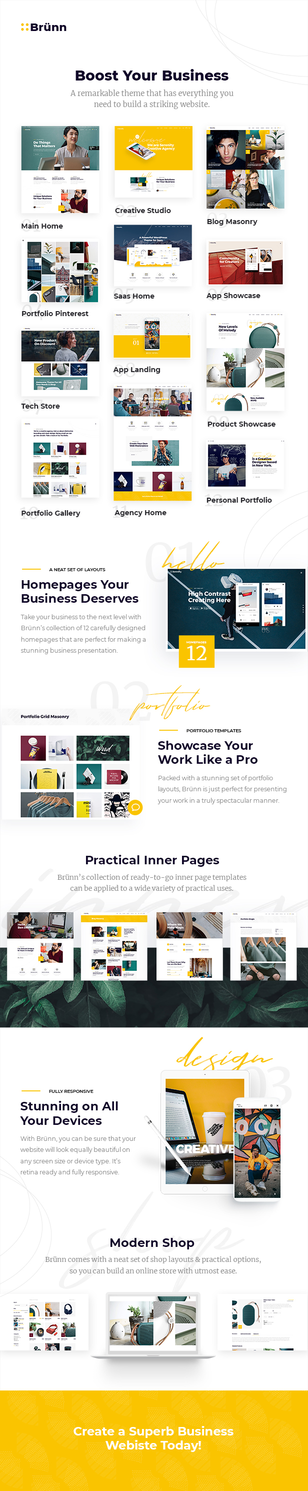 Brünn is a remarkable WordPress theme specifically made for creative agencies and all sorts of creative business websites. Its highly practical elements and powerful features are perfect for building modern business websites.